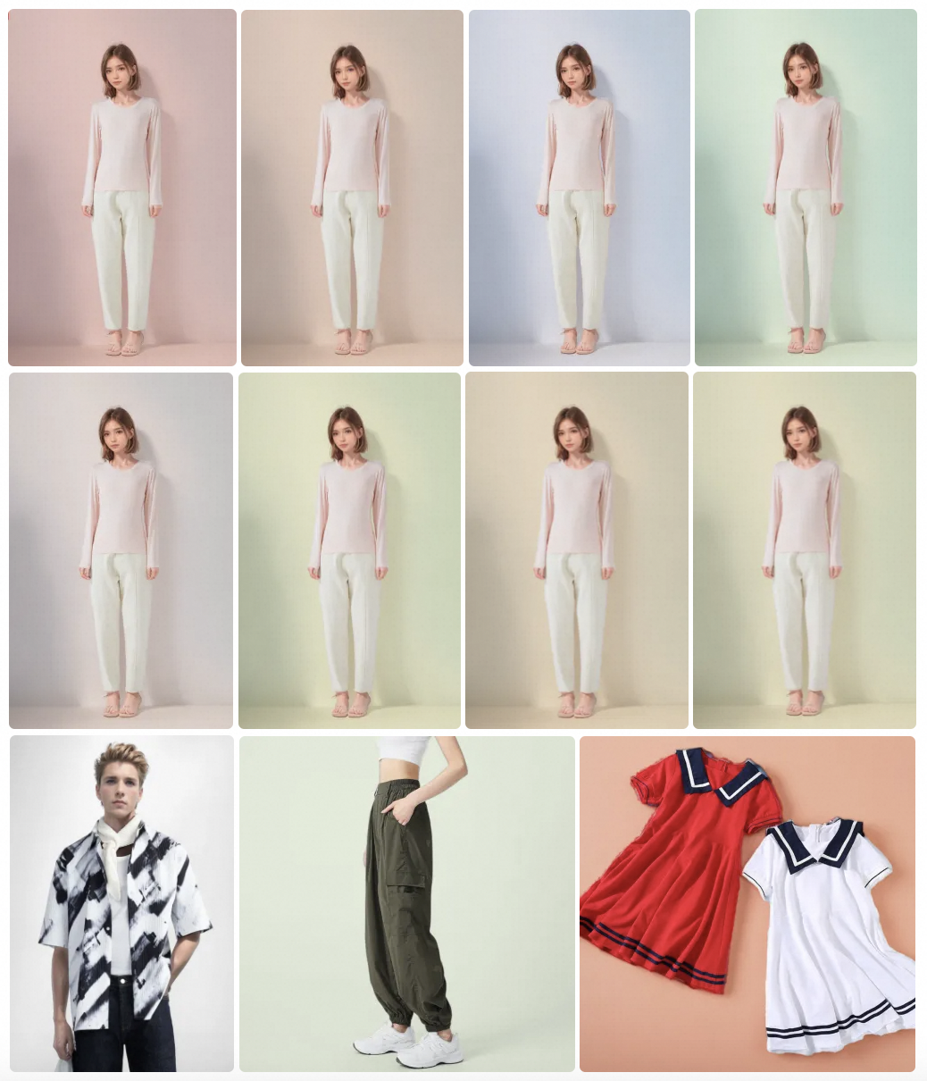 基于这种两步法,我们能比较稳定地实现指定颜色的纯色背景生成,效果如下所示:
