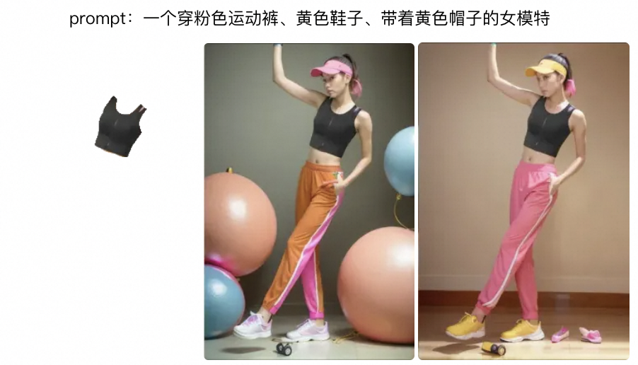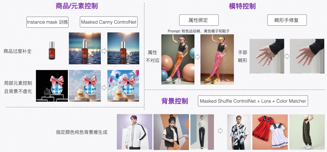 同前景不同背景生成图 然而在这一过程中,我们在商品/元素控制、模特控制、背景控制上也遇到了一系列挑战。如商品特征不准确、控制局部元素和背景虚化间存在trade off、模特属性与描述不匹配、模特手部畸形、指定颜色的纯色背景生成困难等问题。为了达到更好的效果,我们进行了一番探索并总结出了若干有效的控制方法。在接下来的文章中,我们将围绕各个问题进行详细阐述。