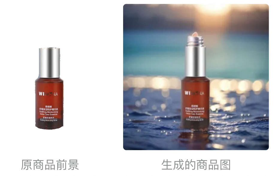2. 商品/元素控制 为了实现商品换背景这一功能,最直接的方法是采用图像修复(inpainting) 技术。具体来说,我们可以结合使用SD模型与inpainting controlNet ,将抠出的商品视作图像的前景部分,而将其余区域视为待处理的背景。然后通过prompt精准地指导背景的修复内容。然而,直接应用开源模型容易导致商品的过度补全问题,商品特征难以正确保持。如下图展示的例子,一瓶精华液上长出了一个多余的盖子,这显然是难以接受的。为了解决这个问题,我们提出了两种方法:一是进行实例掩模(instance mask) 训练,二是在推理时引入基于掩码的Canny边缘控制网络(Masked Canny ControlNet,详见论文>>https://arxiv.org/abs/2404.14768) 。