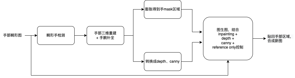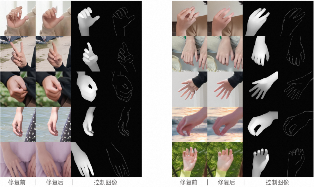 仅依赖扩散模型自身的能力并不能保证手部区域的稳定正确生成,这可能是因为手部结构精细、手势变化万千但又具有特定的物理规律。借鉴脸部修复的思路,我们考虑采用后处理的方式,先生成图像,再检测畸形手,将畸形手区域进行局部放大和重绘。但手势比脸部五官的模式更为复杂,直接重绘容易出现手腕、手势和原图对应不上等问题,且畸形率仍然很高,因此我们引入了额外的结构控制来保持一致性。