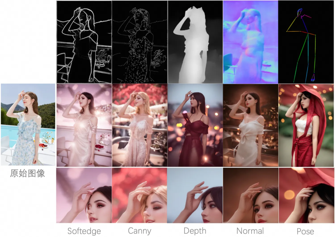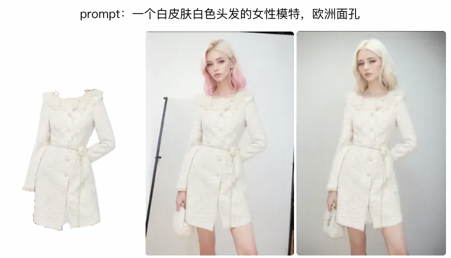正是出于这样的设想,我们基于SD和一些图像控制模型(如controlNet[2])成功实现了这一功能,并推出了AI创意生产工具—— 万相实验室 (https://agi.taobao.com/) ,生成效果如下图所示,页面上轻松点选,短短几分钟,同一个商品便可以轻松拥有千变万化的背景场景,服装模特也可以调整各种肤色发型。
