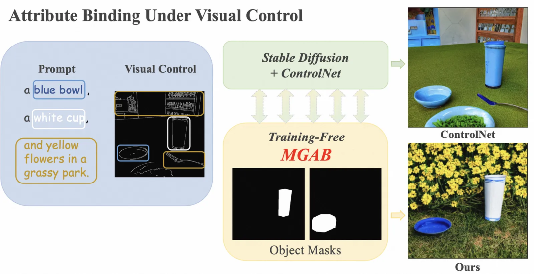 目前已有文章[3]分析属性绑定问题主要是在于属性和物体的attention map重合度不高,于是有了许多training-free方法[4-6]在text-to-image文生图场景来解决这个问题。但将这些方法应用到我们的场景中时,发现图像控制图像导致其效果大打折扣,要么属性绑定失败率较高,方法失效;要么容易违背视觉条件的控制,产生用户不想要的结果或者artifacts。为此,我们提出了一种新的training-free的方法“Mask-guided Attribute Binding”(MGAB,详见论文>>https://arxiv.org/abs/2404.14768),在有图像控制的条件下实现精准的属性绑定。