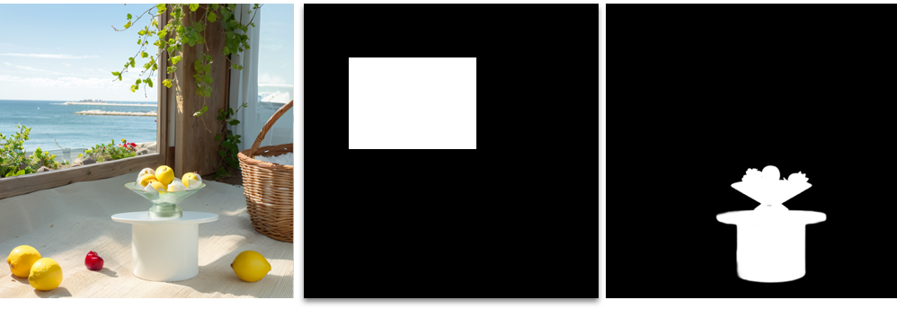 2.1 Instance Mask训练 从普通inpainting模型的训练过程中,可以分析出商品过度补全的主要原因在于,在数据构造过程中,会在图像上随机圈出一个区域生成mask(如下图所示),以该mask划分前背景来训练,图上的物体很容易被这个mask给截断,因此训出的模型倾向于对物体外观形状进行联想补全。为了减少这种现象,更好地生成商品图,我们收集了一批淘宝商品图像,通过牛皮廯过滤、美观度打分等操作过滤出较为优质的数据,再通过分割模型得到商品前景的mask(如下图所示),以这种instance mask构建数据集并训练inpainting模型。