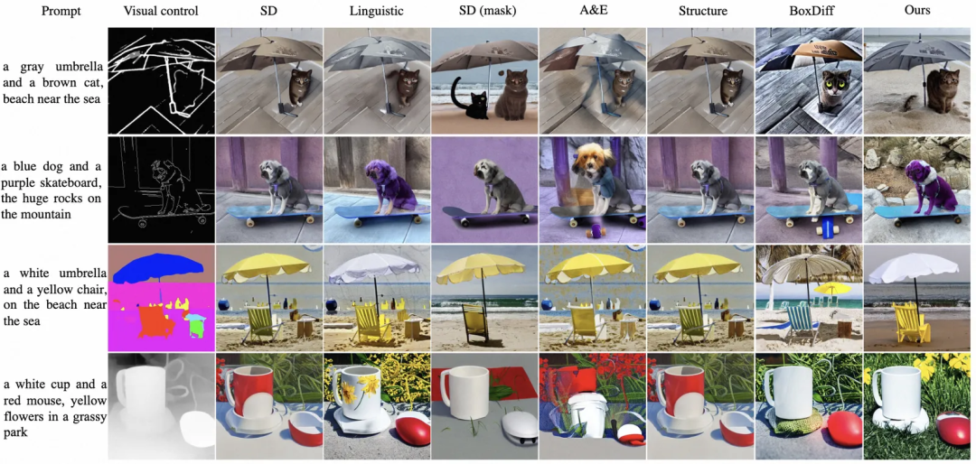 3.2 效果展示 我们分别结合四种不同类型的ControlNet,复现了各种提升属性绑定准确度的方法,并与我们的方法在coco上进行实验和对比。可以看到我们的方法在属性绑定、与prompt的匹配程度等方面均有比较明显的提升,且并不会对成图质量产生明显的负面影响。