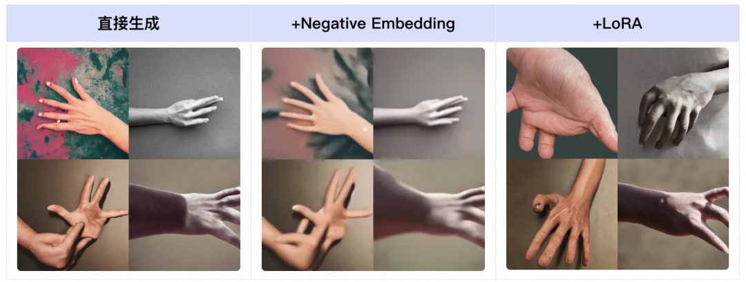 4. 模特手部控制 在生成模特的过程中,手部畸形也是常见的一个问题。我们关注到社区中现有的几种优化方案,包括Negative Prompt、Negative Embedding[7]、LoRA[8]等轻量级方案。如下图所示,我们尝试了以上方法,发现相比于直接生成手部图像,使用这些方法只能带来极其有限的改进效果。