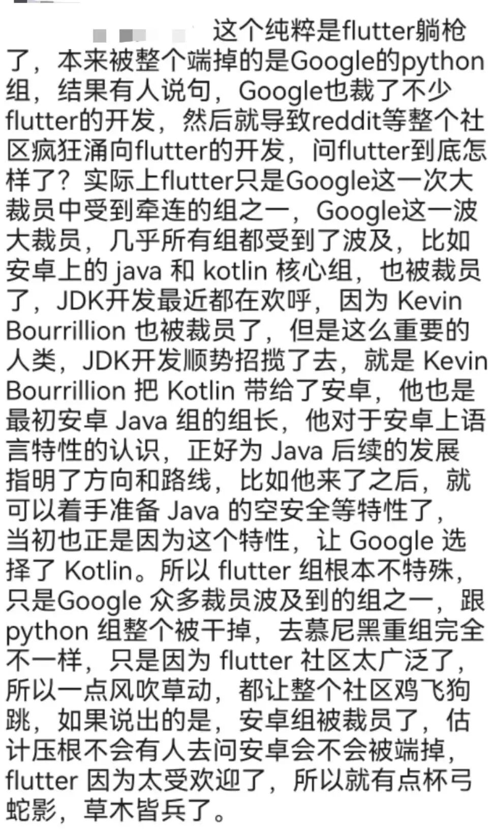 Flutter 团队被裁员消息最早是官方团队成员透露的,当时 Flutter 和 Dart 的一位 PM 在 X 平台上发帖称,此次裁员影响了很多团队,并且 “很多伟大的项目都失去了人员”。