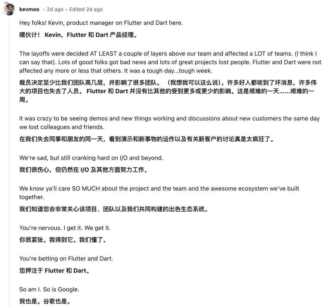 今日,Flutter 团队产品经理 Zoey 也进行了回应,称其所在团队未受影响,并提到了这是团队在执行谷歌高层的“地点重构”战略,目的是在其他地区用更低的人力成本招聘员工。