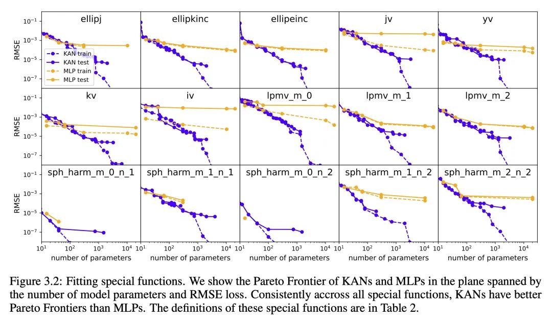 - KANs 在函数拟合任务中表现出更高的准确性,例如对于特定函数的拟合,它们的性能超越了传统的 MLPs。