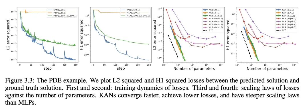 - 在求解偏微分方程(如泊松方程)的问题上,KANs 相较于 MLPs 展现了更高的求解精度。