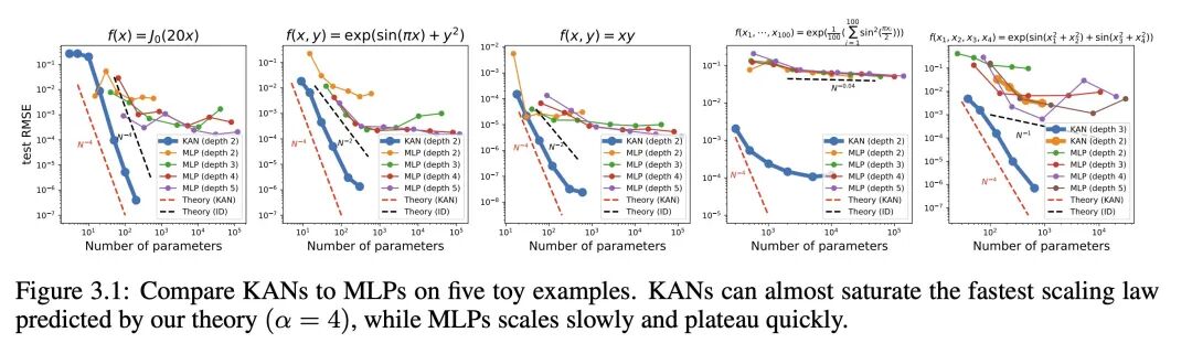- 神经网络的“scaling laws”:KANs 相比 MLPs 展现出更快的规模增长速度,这一优势在数学上得益于 Kolmogorov-Arnold 表示定理的坚实基础。所以 KANs 的规模增长指数不仅在理论上成立,实际上也可通过实验观察到,证实了其在实践中同样高效的扩展能力。