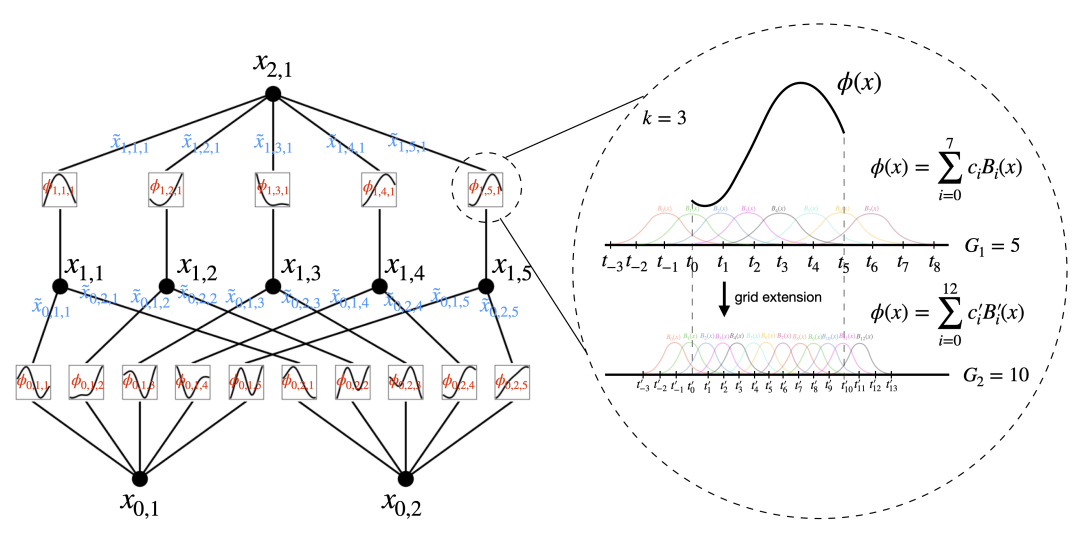 - 适应性和灵活性:利用样条基函数的内在局部性,KANs 支持适应性设计和训练,比如引入多级训练策略,提高模型的准确性和训练效率。这种适应性使得 KANs 能更好地匹配不同任务的需求。