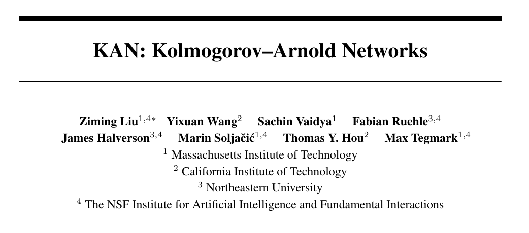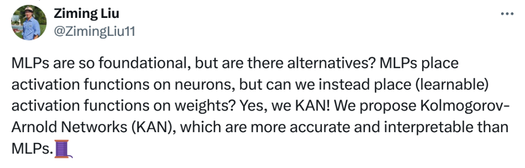KAN 的灵感来源:Kolmogorov-Arnold 表示定理是个啥?Kolmogorov-Arnold 表示定理(Kolmogorov-Arnol'd Representation Theorem 或 Kolmogorov Superposition Theorem)是数学中的一个重要结果,由苏联数学家安德烈·尼古拉耶维奇·科尔莫戈罗夫(Andrey Nikolaevich Kolmogorov)和弗拉基米尔·伊戈列维奇·阿诺尔德(Vladimir Igorevich Arnold)分别独立提出。这个定理表明了连续函数的一种非常有趣的表示形式,它对于理解函数的复杂性以及在某些领域,如机器学习、科学计算和函数逼近有着重要的意义。Kolmogorov-Arnold 定理大致上是说,任何在 n 维实数空间上的连续函数 f(x),其中 x = (x1, x2, ..., xn),都可以表示为一个单一变量的连续函数 h 和一系列连续的双变量函数 gi 和 gi,j 的组合。具体来说,定理表明存在这样的表示形式:其中,h 是一个在实数轴上的连续函数,而每个 gi 和 gi,j 都是定义在实数上的连续双变量函数。这个表示表明,即使在一个高维空间中的复杂函数,也可以通过一系列较低维度的函数操作来重构。1957 年,“现代概率论之父”科尔莫戈罗夫(下图左)首次提出了这个定理,展示了一种将多变量函数简化为单变量函数叠加的方法,这一成果在当时是极为创新的。后来,阿诺尔德(下图右)对科尔莫戈罗夫的工作进行了独立的证明和拓展,使得这个定理得到了更广泛的注意和应用。无巧不成书,在 Kolmogorov-Arnold 表示定理诞生一年之后的 1958 年,被后世称为“神经网络之父”的弗兰克·罗森布拉特(Frank Rosenblatt)在他的著作《Perceptron》中介绍了一个包含输入层、隐藏层(该隐藏层具有随机且不进行学习的权重)以及具有学习连接的输出层的分层网络,如今这被视为 MLP 的雏形,它并不等同于现代意义上具有反向传播能力的 MLP,也未形成深度学习网络的概念。KAN 的设计灵感正是来源于 Kolmogorov-Arnold 表示定理。前面提到,该定理表明,任何多元连续函数都可以表示为单变量连续函数的两层嵌套叠加。基于这一理论,研究人员创新性地将此数学概念应用到了神经网络架构的设计中,创造出了 KAN。当然,KAN 的名字 Kolmogorov-Arnold Network 也正是直接以这两位数学家命名,未来 KAN 若是成为了机器学习的范式,全世界都需要记住这两位的名字……KAN 的核心创新在于,它不是像传统 MLP 那样在网络的神经元上应用固定的激活函数,而是在权重上应用可学习的激活函数。这些一维激活函数被参数化为样条曲线,从而使得网络能够以一种更灵活、更接近 Kolmogorov-Arnold 表示定理的方式来处理和学习输入数据的复杂关系。这种设计使得 KAN 能够以一种理论上更高效、更通用的方式逼近复杂的函数关系,理论上可能在某些任务上超越了 MLP 的性能。简而言之,KAN 是 Kolmogorov-Arnold 表示定理的一次直接应用,它试图通过参数化的激活函数和特殊的网络架构设计,实现对复杂数据分布更优的建模能力,从而在实践中展现出相较于传统 MLP 架构的优越性。KAN 的论文一作刘子鸣(下图左)是一位兼具物理与机器学习背景的研究者,他出生于武汉,在北京大学物理学系完成本科学业,早年还在微软亚洲研究院实习。如今刘子鸣正于麻省理工(MIT)与人工智能与基础科学研究所(IAIFI)攻读博士三年级,师从 Max Tegmark(下图右)。KAN 的成果正是由刘子鸣与老师 Max Tegmark 及来自 MIT、东北大学、IAIFI 和加州理工学院(Caltech)的优秀合作者共同完成。刘子鸣的研究热情聚焦于 AI 与物理学(乃至整个科学界)的交融地带,探索三个核心方向:
