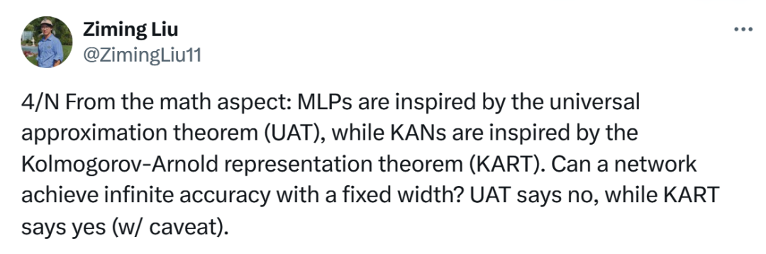- 多层感知器(MLPs)的设计理念受到了万能近似定理(UAT)的启发。这个定理表明,在理想条件下,具有足够多隐藏层的 MLP 能够以任意精度逼近任何连续函数。然而,它并没有直接说明固定宽度(即网络的层数和每层的神经元数量保持不变)的网络能否达到无限的预测精度。而基于 Kolmogorov-Arnold 表示定理的 KANs,则在满足一定条件的情况下,理论上能够实现固定宽度网络对某些函数的无限精度逼近(事实上也伴随着特定的限制或前提条件)。