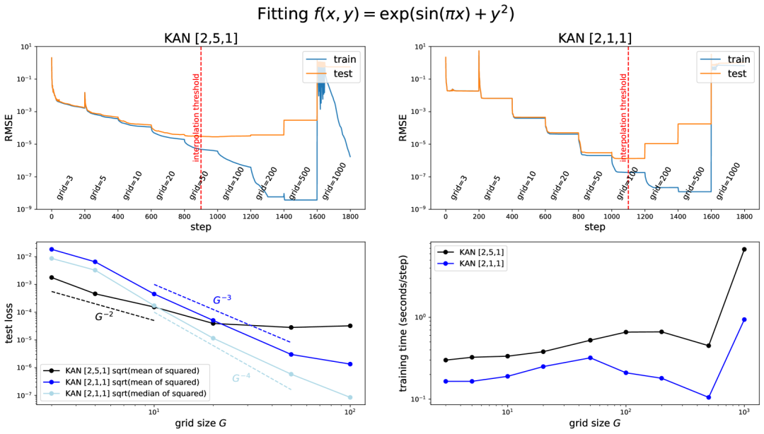 MLPs 不行,KANs 行——千言万语束成一句话:Yes we KAN!KANs 的核心创新在于它们将传统的 MLPs 中的节点激活函数转移到了网络的边(权重)上。论文中提到,“KANs 在边上具有可学习的激活函数,而 MLPs 则在节点上设置固定激活函数。”具体实现上,KAN 的所有权重参数被单变量函数取代,这些函数被参数化为B样条曲线,每个一维函数都具有可训练的局部 B 样条基函数系数(参见下图右)。这种设计允许网络更灵活地逼近复杂的函数关系。论文指出,尽管原始的 Kolmogorov-Arnold 表示仅对应于两层网络,但作者们通过类比 MLPs 的层次结构,提出了一种深化 KAN 的方法。他们定义了一个 KAN 层,它由一组一维函数构成,这些函数以矩阵形式组织,输入和输出维度分别为 nin 和 nout。文中阐述:“一个具有 nin 维输入和 nout 维输出的 KAN 层可以定义为 1D 函数的矩阵 Φ={ϕq,p},其中函数 ϕq,p 具有可训练参数。” 这一突破使得 KAN 能够通过堆叠更多这样的层来构建更深层的网络,从而理论上能够更加精确地逼近任意复杂度的函数。使用网格扩展(Grid Extension)以提升精度KANs 的一个关键优势在于它们能够利用样条函数的特性,通过增加网格的精细度(即网格扩展),理论上可以无限接近目标函数的精度。与 MLPs 不同,后者提高精度主要依赖于增加网络的宽度和深度,这通常伴随着训练成本的大幅增加且效果提升缓慢,KANs 则可以通过简单地细化其内部样条函数的网格来实现,无需从头开始重新训练更大的模型。作者通过一个示例(包含变量 x 和 y 的复合函数)来展示网格扩展的效果,说明随着网格点数量的增加,训练损失迅速下降,但测试损失呈现先降后升的 U 形曲线,反映了偏差-方差权衡的问题。这一观察结果提示,存在一个最优的网格大小,即插值阈值,使得模型既不过拟合也不欠拟合,达到最佳泛化性能。研究发现,较小规模的 KANs(例如上图 [2,1,1] 配置)相比较大规模的(如上图 [2,5,1] 配置)在特定情况下能取得更好的测试性能,这突显了选择合适 KAN 架构的重要性。此外,KANs 还引入了外部自由度(节点连接构成的计算图)与内部自由度(激活函数内的网格点)的概念。前者负责学习多变量的组合结构,而后者专注于学习单变量函数,这两种自由度的结合使 KANs 具有独特的优势。在数学和物理学的应用上,论文提到了 KANs 能够辅助科学家发现或重新发现定律。例如,在无监督模式下,KANs 成功地重新发现了已知的数学关系,如体积 V 与密度 μr 及长度 λ 的关系 V=μrλ。此外,KANs 还探索了安德森局域化现象,这是一种量子系统中的重要现象,其中随机无序导致电子波函数局限,进而阻止所有传输。论文提及:“在三维中,存在一个临界能量,它划分了扩展态与局域态,称为移动边缘。对这些移动边缘的理解对于解释固体中的金属-绝缘体转变等基本现象至关重要。”