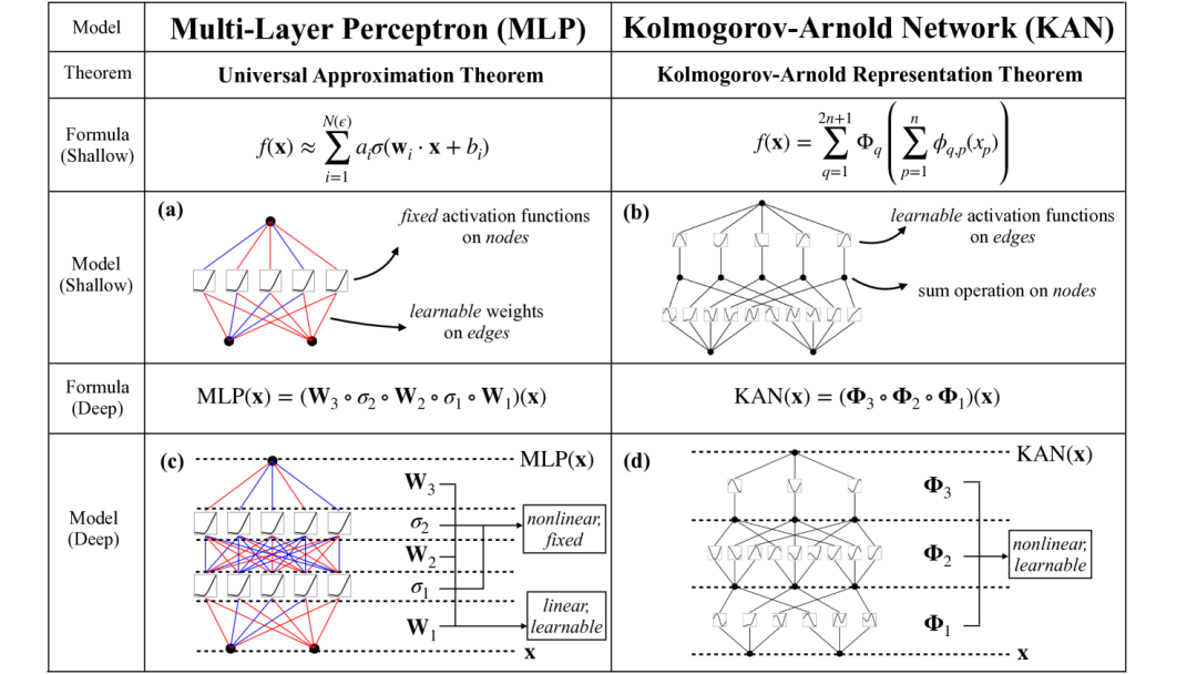 但 AI 发展到今天,MLP 几乎一点没变,人类的需求却越来越多了。MLP 在庞大的需求压力下暴露出了一个又一个缺点:可解释性和交互性不足、处理大尺寸图像的时候计算复杂且有过拟合问题、缺乏灵活性和适应性、自动特征提取方面的能力较弱……4 月 30 日,全新的神经网络架构 KAN 横空出世。它的使命只有一个:取代 MLP。KAN 全称 Kolmogorov-Arnold Networks,其最大意义就是作为 MLPs 最具潜力的替代品,提出了全新的架构思路。KAN 受到 Kolmogorov-Arnold 表示定理的启发,在以下几个方面展现了显著的优势:- 增强的准确性与效率:与传统 MLPs 相比,KANs 能够使用更少的参数达到相同或更好的准确度,尤其是在数据拟合和偏微分方程求解等任务中。这意味着在处理复杂科学和数学问题时,KANs 可能提供更高效的解决方案。