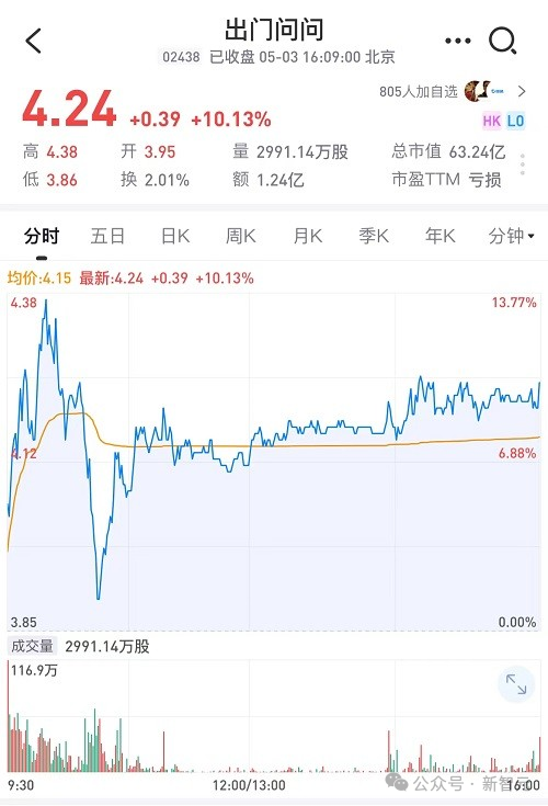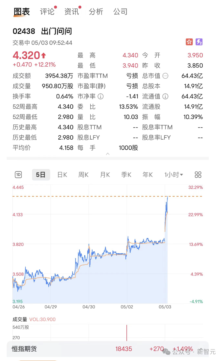 4月29日,出门问问盘中一度涨超10%,直接领涨港股AI板块。