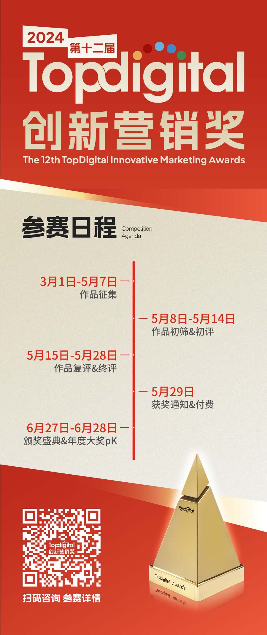 每年TopDigital创新营销奖备受全行业关注。今年,2024第十二届TopDigital创新营销奖全面覆盖营销案例类、创意作品类、年度专项类、年度产品类、年度机构、年度人物等多个类别,共有180+个赛道组别,千家企业共同竞选,直面150+名行业大咖。