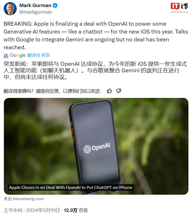 5月11日,彭博社记者马克・古尔曼(Mark Gurman)今日发文表示,苹果即将与 OpenAI达成协议,为今年的新iOS系统提供一些生成式AI功能(如聊天机器人)。此外,苹果与谷歌就整合 Gemini 的谈判正在进行中,但尚未达成任何协议。