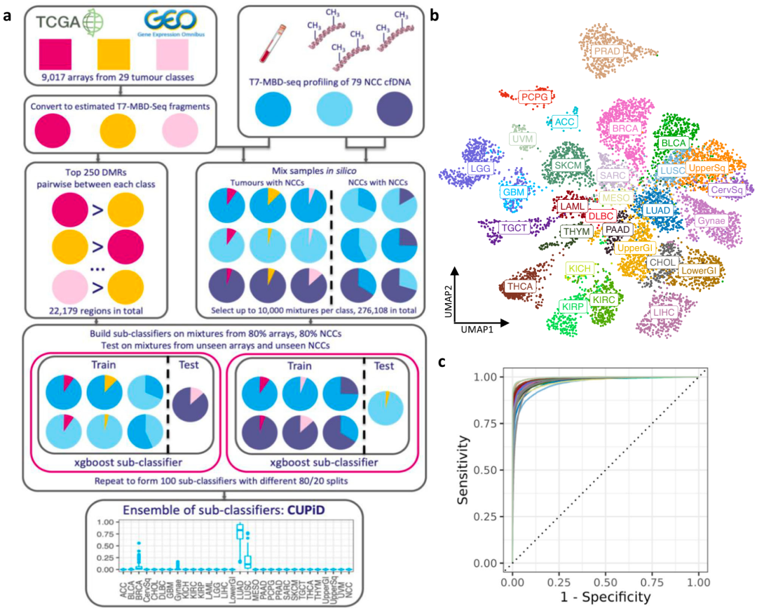 随后,研究团队使用差异甲基化区域(DMR)计算肿瘤特异性基因组区域,并对30个类别进行比较,选择了差异最大的250个DMRs;对这些DMR进行降维处理并应用于9,017个肿瘤样本。基于上述数据,研究团队建立了一个名为CUPiD的集成分类器,由100个独立的梯度增强树子分类器组成,其中每个子分类器均在肿瘤患者队列和NCC混合模拟数据上进行了训练。经验证,CUPiD的平均多类别受试者操作曲线下面积(AUROC)为0.984。图1. 基于cfDNA甲基化数据的组织来源分类器的构建