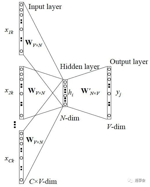 2.2.2 CBOW 模型 CBOW (continuous bag-of-words) 的目标是根据上下文来预测当前词语的概率,且上下文所有的词对当前词出现概率的影响的权重是一样的,因此叫 continuous bag-of-words 模型。与 Skip-gram 模型不同,CBOW 输入变成了多个单词,所以要对输入进行处理,一般是求和然后平均。