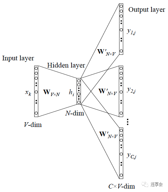 2.2.1 Skip-gram 模型 Skip-gram 即跳词模型,训练时词汇 为独热编码形式的输入 (这里为什么是 one-hot 形式而不是 distributed,请读者思考,答案就在上文中), 是在词库中所有词汇上输出的概率。最终,我们希望真实的
