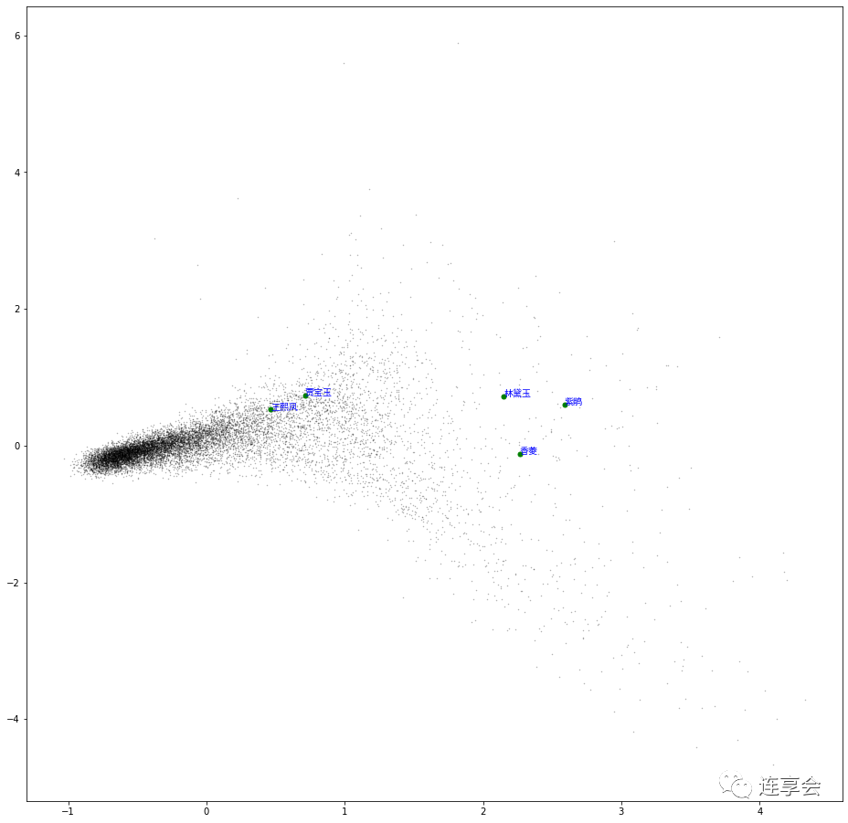 rawWorVec = [] word2ind = {}for i,w in enumerate(model.wv.index_to_key): #生成序号,词语 rawWorVec.append(model.wv[w]) #词向量 word2ind[w] = i rawWorVec = np.array(rawWorVec) #降维之前的20维数组 X_reduced = PCA(n_components=2 ).fit_transform(rawWorVec) #降维之后的2维数组 fig = plt.figure(figsize = (16 ,16 )) ax = fig.gca() ax.set_facecolor('white' ) ax.plot(X_reduced[:,0 ],X_reduced[:,1 ],'.' ,markersize=1 ,alpha=0.3 ,color='black' ) words = ['紫鹃' ,'香菱' ,'王熙凤' ,'林黛玉' ,'贾宝玉' ] # 绘制单个词汇的向量 zhfont1 = matplotlib.font_manager.FontProperties(fname='C:\\Windows\\Fonts\\simhei.ttf' ,size=10 )for w in words: if w in word2ind: ind = word2ind[w] xy = X_reduced[ind] plt.plot(xy[0 ],xy[1 ],'.' ,alpha=1 ,color='green' ,markersize=10 ) plt.text(xy[0 ],xy[1 ],w,alpha=1 ,color='blue' ,fontproperties=zhfont1)