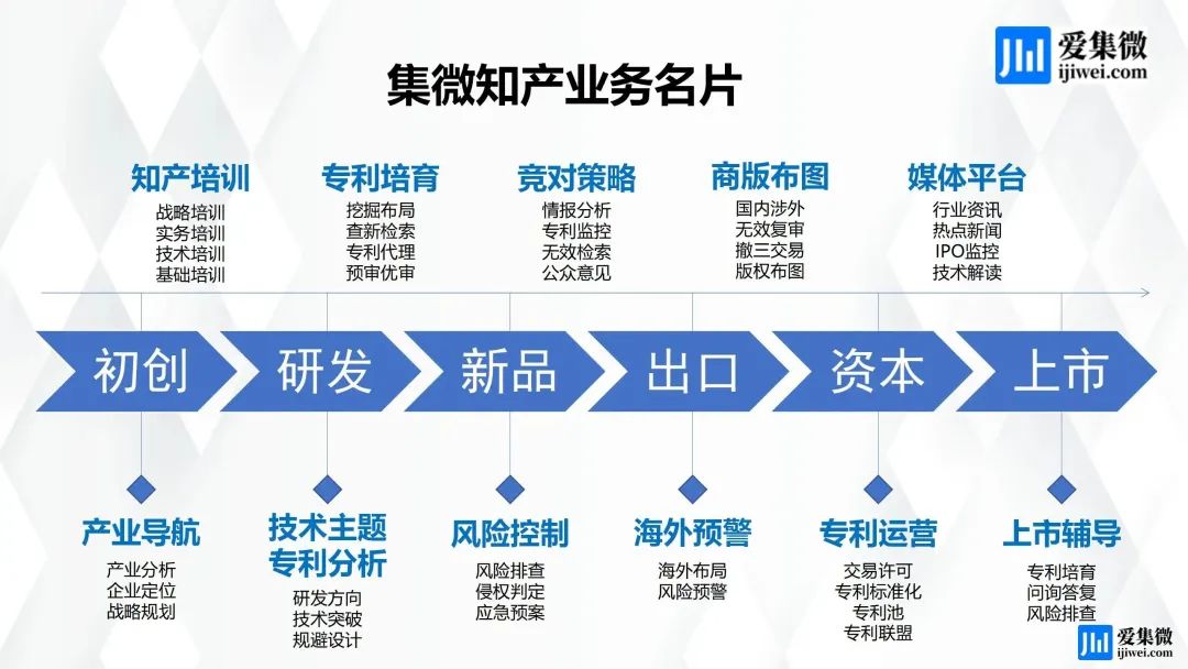 “集微知产”由曾在华为、富士康、中芯国际等世界500强企业工作多年的知识产权专家、律师、专利代理人、商标代理人以及资深专利审查员组成,熟悉中欧美知识产权法律理论和实务。依托爱集微在ICT领域的长期积累,围绕半导体及其智能应用领域,在高价值专利培育、投融资知识产权尽职调查、上市知识产权辅导、竞争对手情报策略、专利风险预警和防控、专利价值评估和资产盘点、贯标和专利大赛辅导等业务上具有突出实力。在全球知识产权申请、挖掘布局、专利分析、诉讼、许可谈判、交易、运营、一站式托管服务、专利标准化、专利池建设等方面拥有丰富的经验。我们的愿景是成为“ICT领域卓越的知识产权战略合作伙伴”。