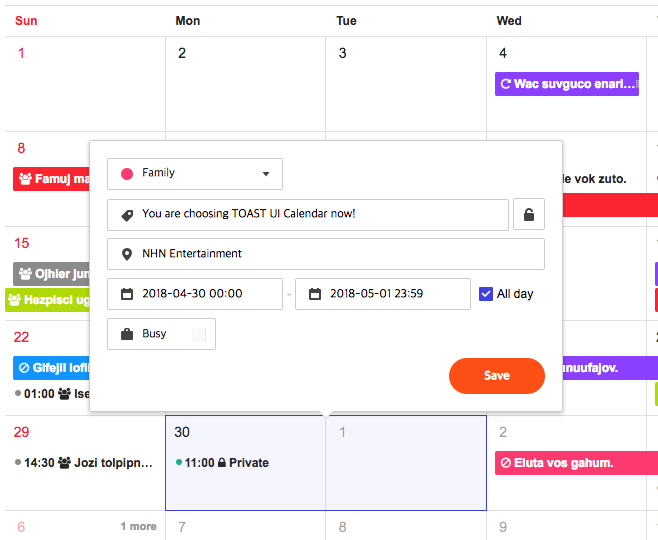 强大的事件管理:tui.calendar支持快速添加事件、拖拽事件、事件提醒等功能,用户可以方便地管理自己的日程安排,确保不会错过任何重要事件。