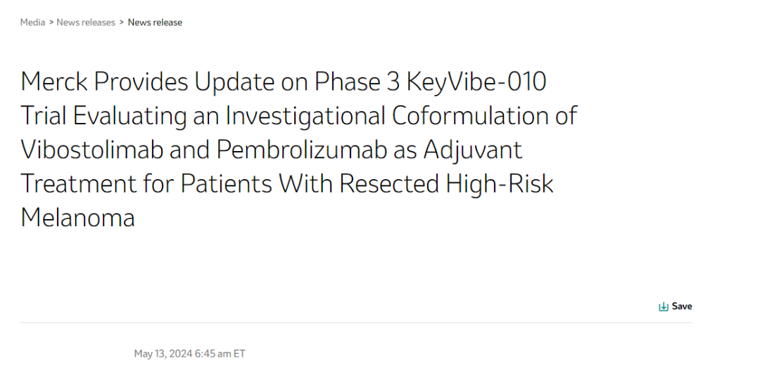 5月13日,默沙东(纽约证券交易所股票代码:MRK)宣布,终止 3 期 KeyVibe-010 试验中的 抗 TIGIT 药物vibostolimab 和 抗PD - 1pembrolizumab(帕博利珠单抗) 联合制剂组治疗皮肤癌的后期试验,由于免疫副作用导致大量患者退出。该试验正在评估vibostolimab和帕博利珠单抗的研究组合,与单独使用帕博利珠单抗相比,作为切除的高风险黑色素瘤(ⅡB -Ⅳ期)患者的辅助治疗。