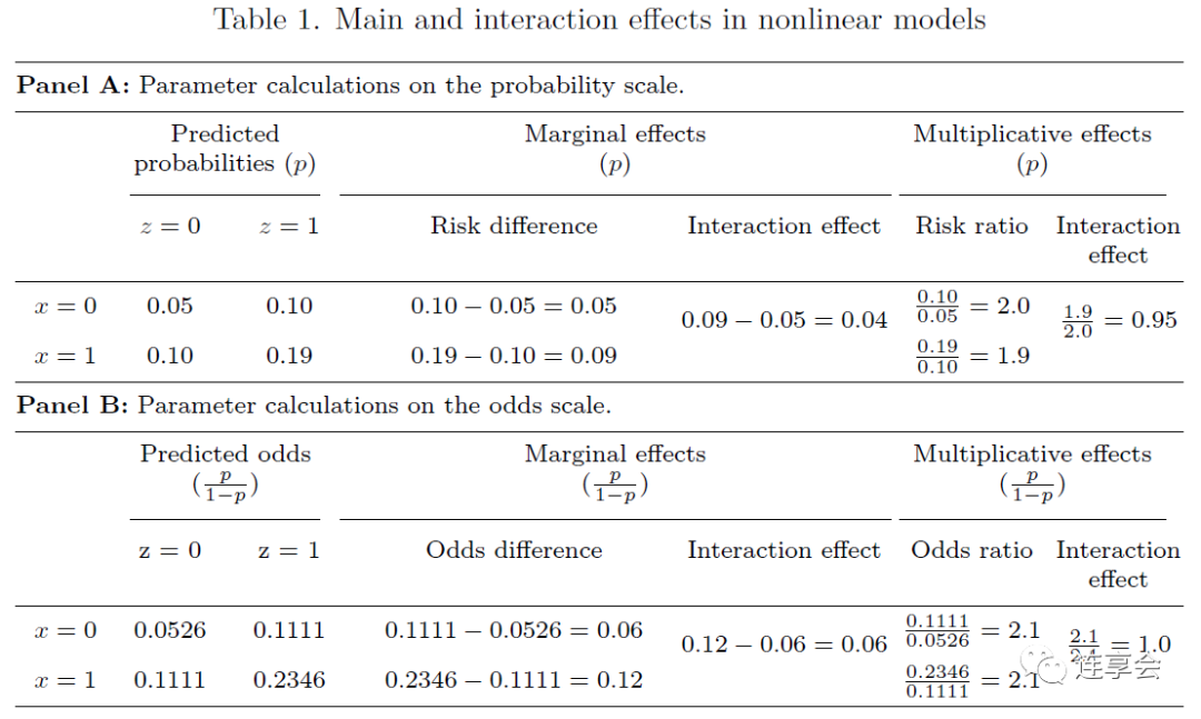 图1 一方面,概率度量上的乘积交互效应为 0.95(表 1 最后一列,面板 A),因为在处理前(x=0)时,处理组(z=1)的 p 为控制组的两倍(0.1/0.05),而在处理后则仅为 1.9 倍(0.19/0.1),这意味着随着 x 增加,z 对 y 的效应在减小。相比之下,优比度量上的乘积交互效应是 1.0(表 1 的最后一列,面板 B),这意味着随着 x 的增加,z 的效应是不变的。