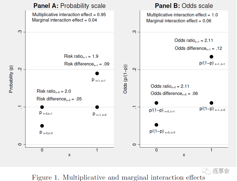 在处理前(x = 0)时,随着 z 从 0 增加到 1,被解释变量取 1 的概率 p 从 0.05 上升到 0.10。当 x = 1 时,随着 z 从 0 增加到 1,被解释变量取 1 的概率从 0.10 增加到 0.19。图 1 的面板 B 则为转换成优比后的相同的四个数据点。