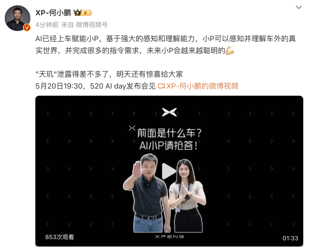 小鹏汽车 AI Day 活动将于今天举办,日前小鹏汽车 CEO 何小鹏预告了一些即将发布的内容。何小鹏表示,自己每天下班都会使用「AI 代驾功能」,可以实现一键上班和一键回家,并透露虽然目前还不能实现停车位到停车位的水平,但是「不远了」。何小鹏还演示了智能助手「小 P」,该智能助手能够实现前方车辆种类、车牌和文字内容识别。何小鹏还称,即将发布的内容将是他们「首次把端到端大模型在中国落地」的 OTA 更新,小 P 也会搭载大模型,并表示希望未来 12 个月内小鹏汽车的 AI 代驾能力和自动驾驶能力大概有 10 倍以上的提高。