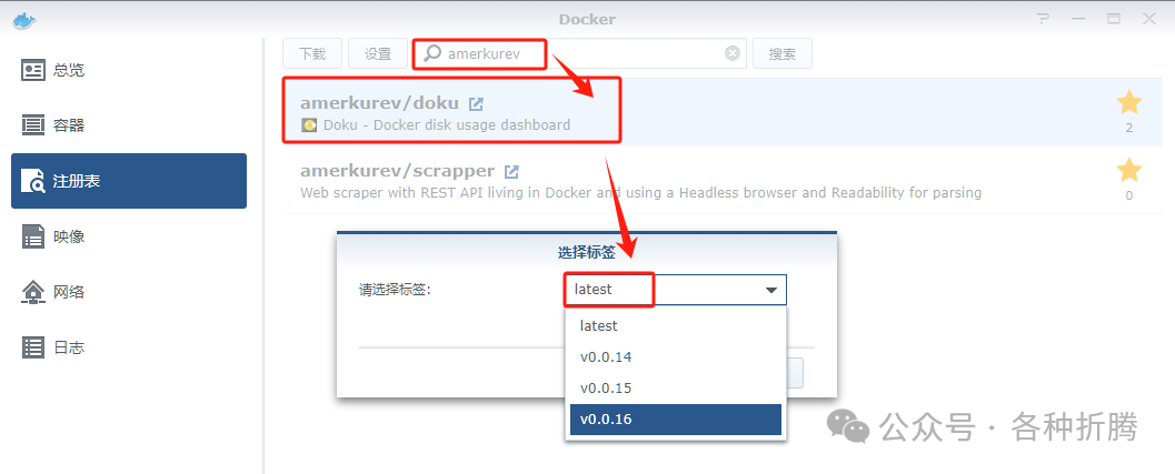 在注册表中搜索 amerkurev ,选择第一个 amerkurev/doku,版本选择 latest。