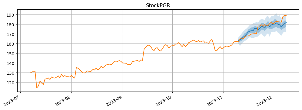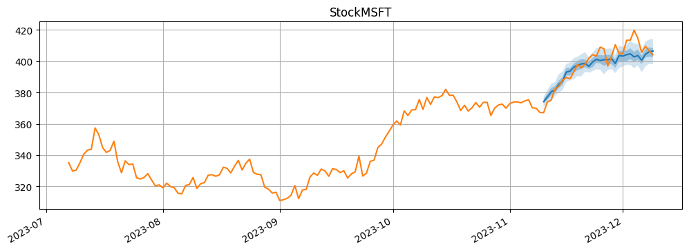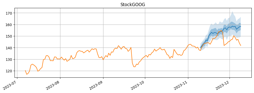 for k in range(len(forecasts)): fig, ax1 = plt.subplots(1, 1, figsize=(12, 4)) forecasts[k].plot(ax = ax1) tss[k].plot(ax = ax1) ax1.get_legend().remove() plt.grid(which ="both" ) plt.title("Stock" + data.columns[k]) plt.show()