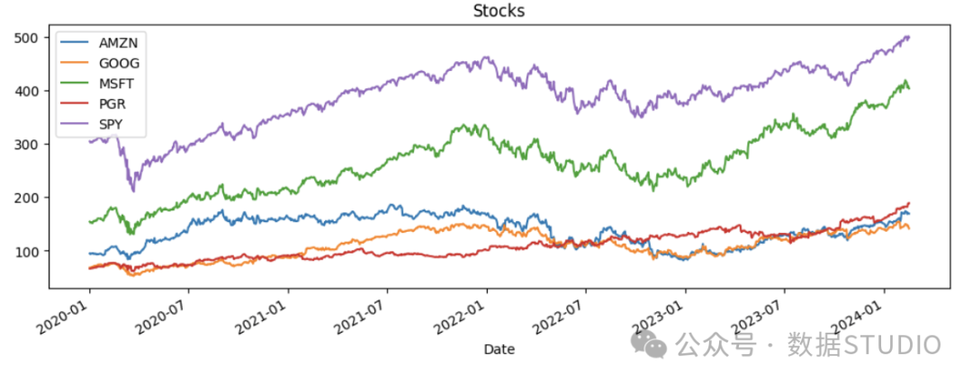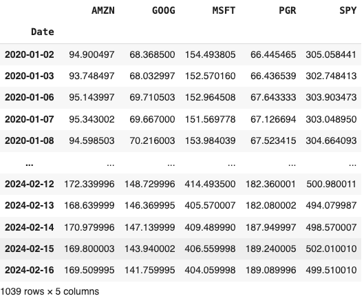 import yfinance as yf data = yf.download(["SPY" ,"MSFT" ,"AMZN" ,"GOOG" ,"PGR" ], start="2020-01-01" , end="2024-12-31" ) data = data[[('Adj Close' , 'AMZN' ),('Adj Close' , 'GOOG' ),('Adj Close' , 'MSFT' ),('Adj Close' , 'PGR' ),('Adj Close' , 'SPY' )]] data.columns = ['AMZN' ,'GOOG' ,'MSFT' ,'PGR' ,'SPY' ]