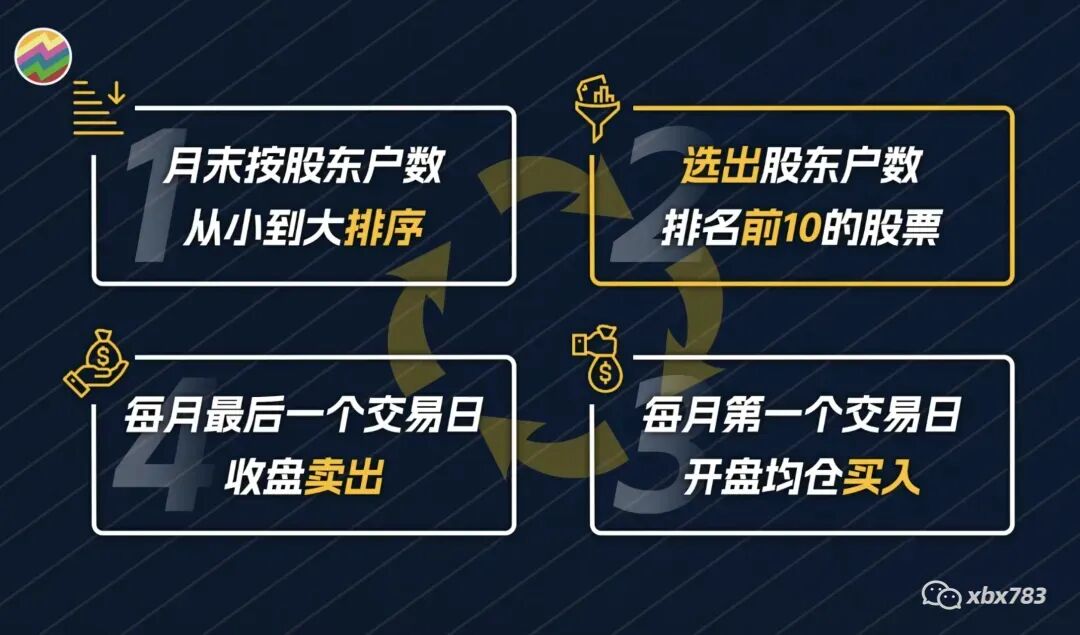 再重新选择下个月股东户数最多的10只股票,并在下下个月的月初买入,如此循环往复。
