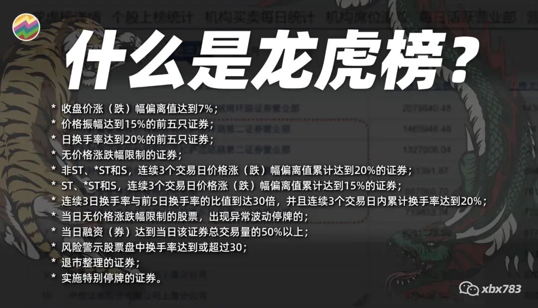每个交易日都会有一些股票的价格出现异常的波动,只要符合下图中任意一个条件的股票,交易所就会把它列出来,放到一个榜单上,这个榜单就是龙虎榜。