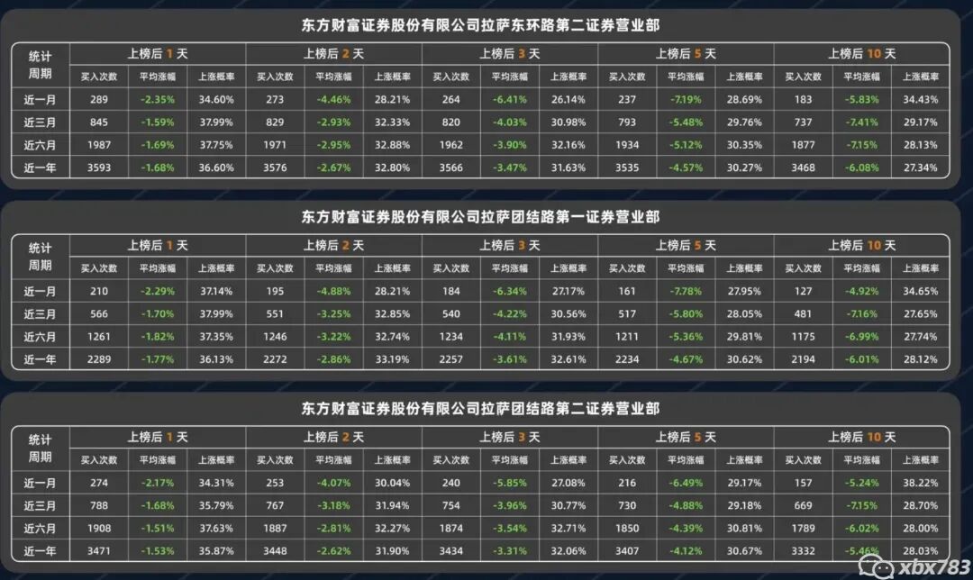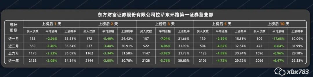 细看上表,可以发现该营业部相关的股票,上榜后大概率是亏的,且上榜越久亏得越多,同时胜率也极低,简直就是追涨杀跌最好的反面教材。