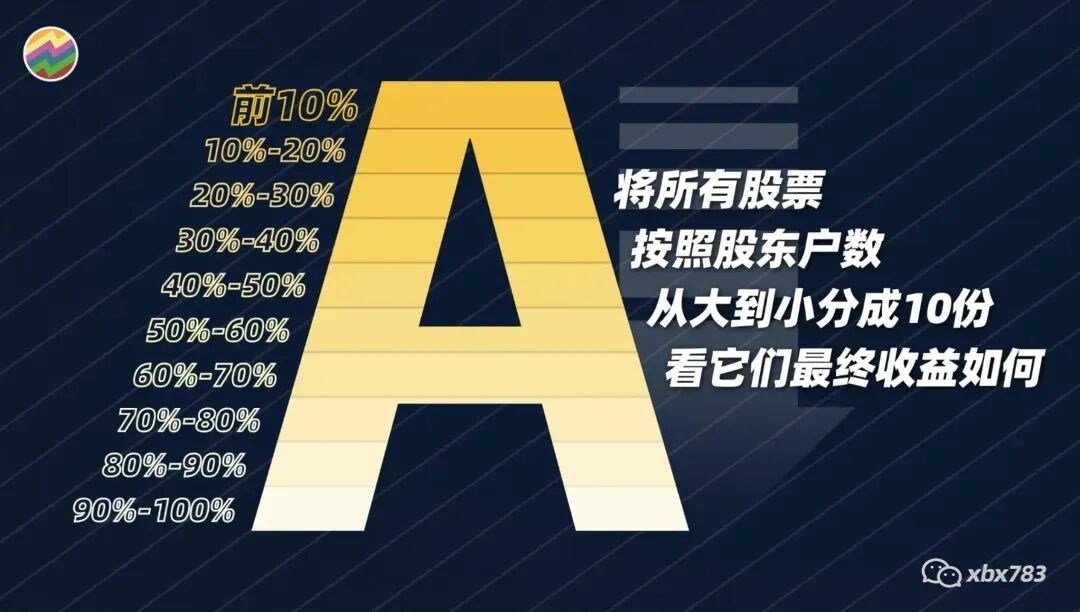 关于股东户数,我们甚至还可以看排名前10%-20%、20%-30%等等等等,一直到90%-100%的股票表现,也就是把所有股票按股东户数从大到小分为10组。