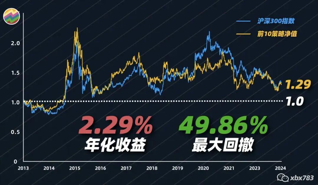 代表策略的橙色曲线从1块钱涨到了1.19元,还不如直接买前10的股票。