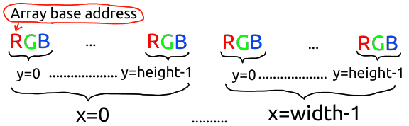 这意味着一个像素的 RGB 值存储在 3 个相邻的字节中,一列的像素在内存中连续存储 - 以 列为主序 。我觉得这种方法很冒犯,因为图像传统上是以 行为主序 存储的,尤其是图像传感器以这种方式发送图像(并以这种方式捕捉图像,正如您可以从滚动快门看到的 - 每一行在稍微不同的时间点进行捕捉,而不是按列进行)