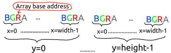 现在,让我们再次来看看 pygame 的 BGRA 数组的内存表示,其形状是 (width, height) 。