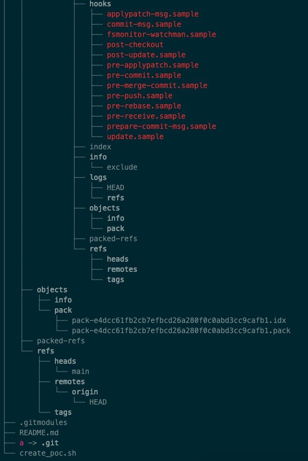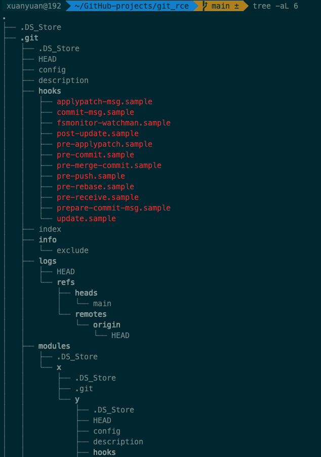 而且关键是它闯进来的位置是在.git/modules/x下面,前面说过,这个目录下面,是子模块所属的.git目录,然后这个闯进来的家伙,还按照.git目录的结构,里面放置一个hooks文件夹,里面放上相关的钩子脚本,等下git clone完成的时候,就会去执行这里的脚本程序了。