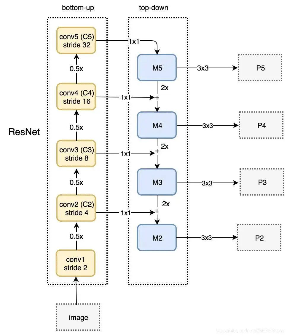 最左侧为普通的特征提取卷积网络(ResNet),C2-C4代表resnet中的四个大的卷积组,包含了多个Bottleneck结构,原始图像的输入就从该结构开始。
