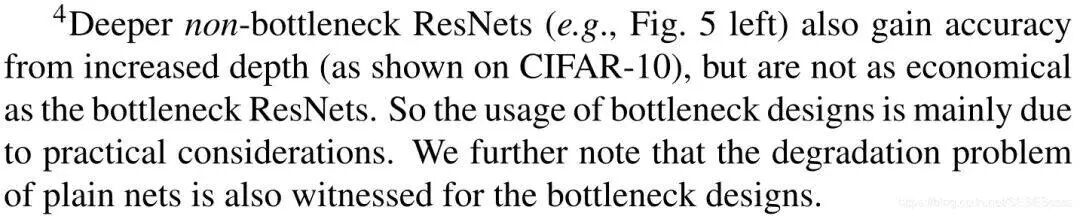 值得注意的是,ResNet使用Bottleneck结构主要是是为了减小网络的参数量(特征降维),在实际中作者注意到,瓶颈结构的使用同样出现了普通网络的退化问题: