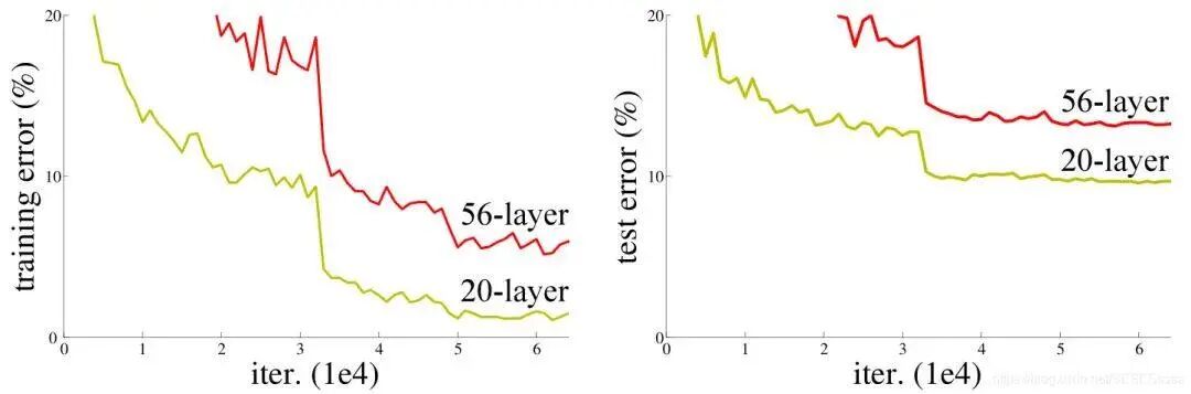在以往的经验上,人们普遍认为通过加深网络的层数能够使得网络具有更强的学习能力,即使网络容易产生过拟合/梯度消失的问题,在现有方法下也可以通过增加数据集,Dropout或者正则化/加入BN层解决。但是通过实验数据发现,即使加入有效的措施抑制网络产生过拟合或者梯度消失,网络的精度也会随着深度的增加而下降,并且还不是由于过拟合引起的(实验数据表明越深的网络training loss反而越高)