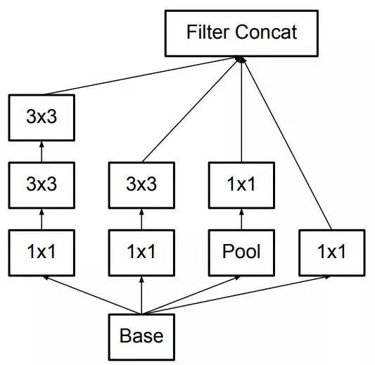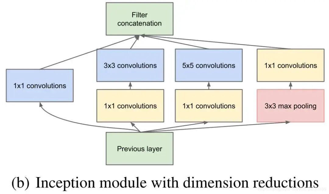 我们或许会有一个疑问,为什么不在3x3或5x5卷积输出上直接降维特征,而非得使用1x1卷积呢,(作者认为这样做能够增加网络的非线性能力,因为卷积和卷积之间有激活函数)