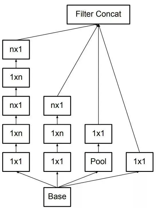 进一步的,Inception v2将nxn卷积分解为两个1xn和nx1卷积(空间可分离卷积 Spatially Separable Convolution),在感受野相当的情况下,进一步减少了网络的参数: