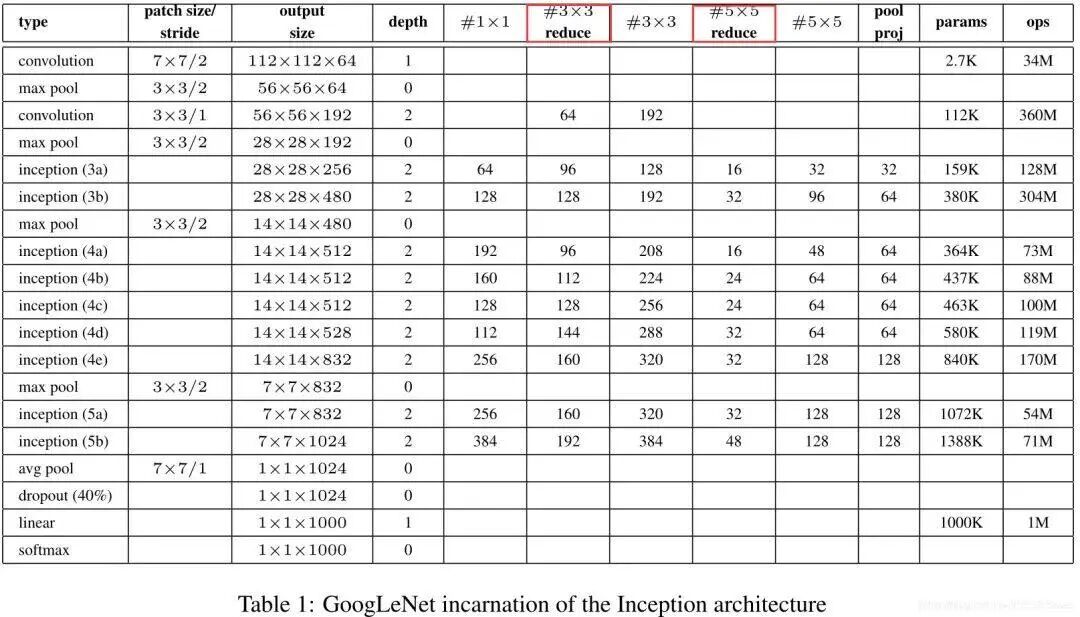 2.2 PyTorch复现Inception v1: 2.2.1 网络的整体框架: 2.2.2 各层的参数情况:红色框表示用于特征降维的1x1卷积