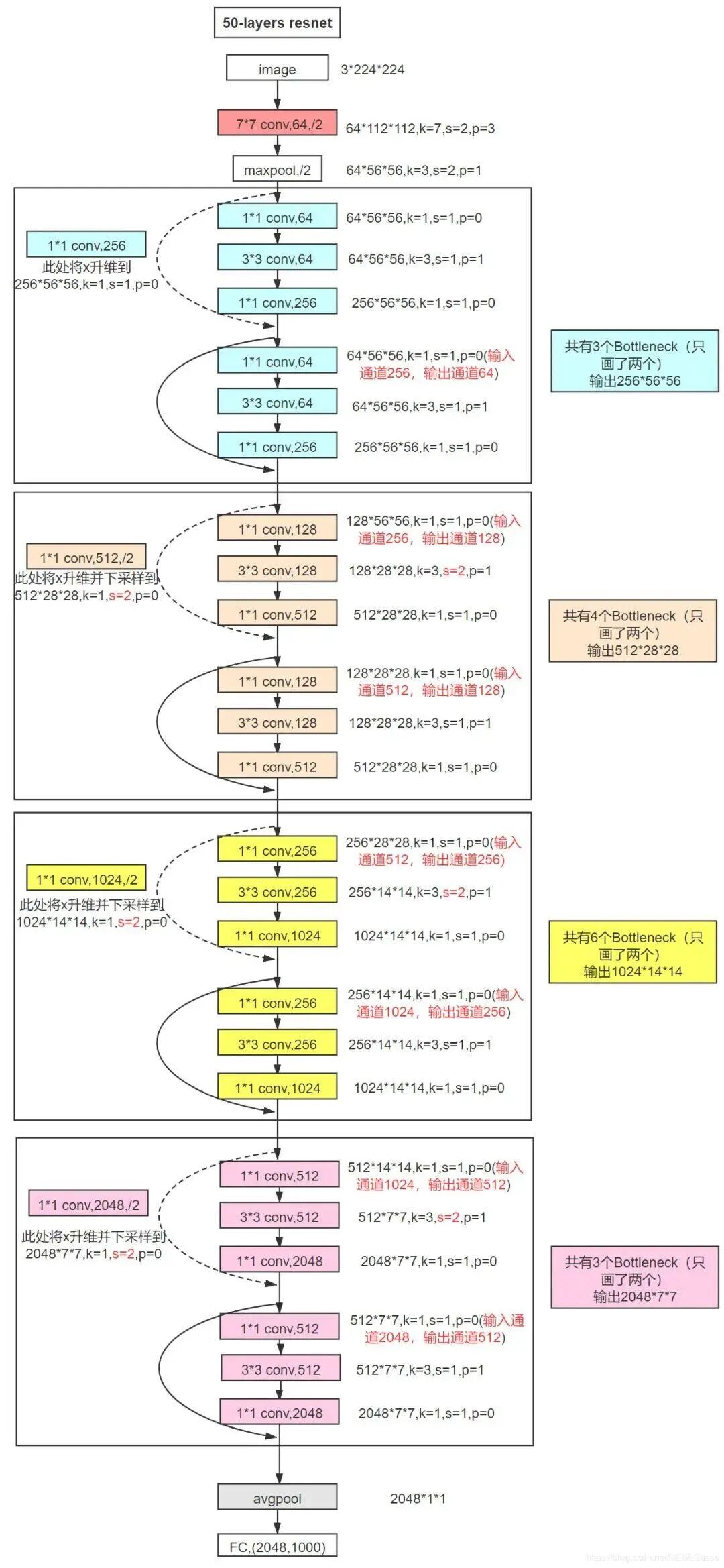 3.2 PyTorch 复现 ResNet-50 3.2.1 ResNet-50网络整体架构 3.2.2 Bottleneck结构论文中将Resnet-50 分成了4个大的卷积组,每一个大的卷积组叫做一个Bottleneck (瓶颈)模块(输入和输出的特征图通道较多,中间的卷积层特征深度较浅,类似瓶颈的中间小两头大的结构)。卷积组与卷积组之间会通过一个shortcut相连。
